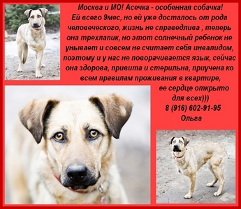 Асе всего 9 месяцев, она стерильна, здорова и привита. Подарите Асе счастье, подарите девочке новую жизнь. Замечательная и очень-очень умная девочка Ася мечтает встретить доброго и заботливого человека. Она ждет его, ведь про человеческую доброту она только слышала. От человека она получила только боль и мучение. Кто и за что издевался над нежной и ласковой девочкой мы не знаем, но нашли мы Асю с сильными увечиями лапки. К сожалению спасти ножку мы не смогли, поэтому у нее теперь только три лапки, но не смотря на это язык не поворачивается назвать ее инвалидом, ведь это совершенно ей не мешает радоваться жизни и с легкостью обгонять во время игры своих четвероногих друзей. Ася очень чуткая и вдумчивая девочка, она знает правила проживания в квартире, не хулиганит и очень аккуратна. Приезжайте знакомиться с Асей