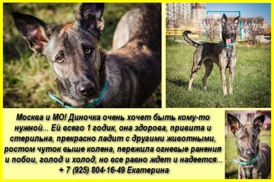 Дине год с небольшим, она стерильна, хорошо уживается с другими животными, так как она на передержке с котами и собаками, но может иногда ревновать. Она чуть немногим выше колена. Здорова и готова к новой семье, есть ветпаспорт. Очень игривая девочка, движушная такая. Скорее для молодого/среднего возраста, чем для пенсионеров. У всех кураторов собаки появляются по-разному. Дину вот забрали из неблагополучной семьи. За год с небольшим своей жизни она узнала и голод, и побои, и поводок, привязанный к ножке дивана. Когда Дину стали лечить и приводить в форму, выяснилось, что в собаку стреляли: была операция по извлечению пуль из тела. Такая молоденькая собака и столько всего пережила, но, что удивительно, не потеряла радости жизни и стремления к человеку. Динка активная и жизнерадостная, пусть белая полоса в её жизни начнется вместе с Вами.