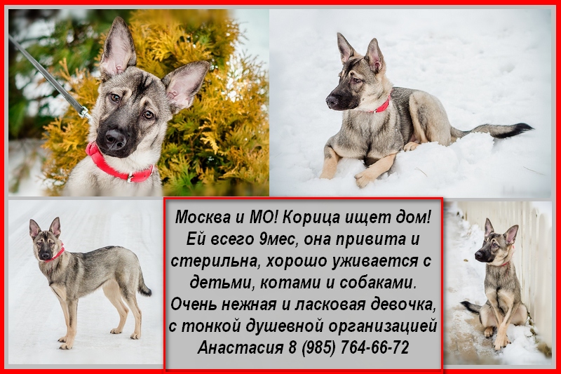 Корице примерно 9 месяцев от роду, ростом она по колено и весит около 15-16 кг. По характеру – активная, но несколько застенчивая и с тонкой душевной организацией: чуть голос повысишь на нее и у нее слезы на глазах и бровки домиком. Кора привита, стерильна и имеет ветпаспорт, приучена к 3-х разовому выгулу (2 раза пока не всегда может вытерпеть), но если дома постелить пеленку, то она делает свои дела на ней, когда совсем невмоготу. Прошла курс ОКД. Отлично уживается с собаками, кошками и детьми (опыт с детьми от 8 лет). Кушает сухой корм с большим аппетитом. Чудесное существо, благодарное и душевное. Пристраивается в квартиру или загородный дом. Когда я ее нашла - она сидела на автостоянке под машиной, маленький щенок, беспомощный и пугливый. У нее была сломана задняя лапа, она скулила, но никто не обращал на нее внимания. Я вытащила ее, отвезла к врачу, лечила, курировала, а теперь пришло время найти Коре постоянный дом.