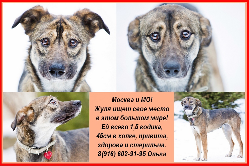Жуле примерно 1,5 года, рост 45 см в холке, привита, здорова и стерильна.Жуля! Жуля это всепонимающее существо, это человечек не умеющий говорить словами, это ребенок и мудрец в одном собачьем теле. Возможно не самом красивом теле, но зато с каким сердечком. Она так трепетно смотрит на человека, она ищет его взгляд, нежно толкает мокрым носом руку, только бы ее погладили, только бы на нее обратили внимание! Она самоотверженно и без остатка готова отдать все свое худенькое тельце и раненную душу тому, кто примет ее, кто поймет и полюбит. Жуле не нужно учить команды, она понимает слова, ей не нужно много места, она будет совершенно счастливо спать на ваших тапочках. Она не избалованна любовью и заботой, она стесняется когда ей говорят, что она красива, она с восторгом воспринимает ласку и поцелуи. Ее просто не возможно не полюбить. Жулю мы нашли в центре города, она робко подходила к прохожим, толпящимся у метро, с надеждой всматривалась в глаза и говорила! Да да, Жуля умеет говорить, она не скулит, не лает, она булькает и мурлыкает, как бы пытаясь повторить человеческую речь. Я могу много и долго говорить про это чудо, но лучше приезжайте и познакомьтесь с ней сами