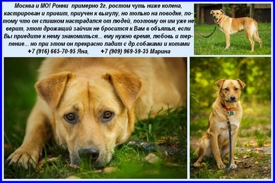 Ронни – спокойный пес, но немного замкнутый, не агрессивен, ладит с котами и собаками, ему примерно 2года. Привит , кастрирован, здоров. Ест сухой корм. Размер средний (ниже колена) вес 24 кг. Приучен к выгулу (2 раза в день), на поводке ходит рядом, не тянет. Выгул СТРОГО на шлейке и поводке. Свободный выгул собаки КАТЕГОРИЧЕСКИ запрещен. В квартире не гадит, не скулит, не лает, вещи не портит, на всякий случай собака приучена на время отсутствия хозяина оставаться в клетке одна . Находясь в клетке не лает и не скулит. Ронни отдается строго по договору, с испытательным сроком ответственным людям готовым проявить доброту и терпение. Ронни очень ранимый пес, который сильно настрадался будучи подростком на улице, из-за этого он немного «бояка» в отношении именно людей. Если Вы готовы проявить терпение , заботу и любовь, то Ронни станет для Вас отличным другом и компаньоном.